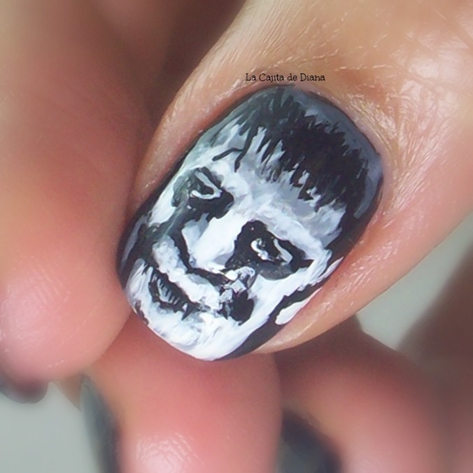¿Who is He?........al final tendremos la respuesta, para la manicura he usado esmaltes de Yanbal tono Cemento y Black majal, con ayuda de las pinturas acrilicas y pinceles de la tienda Born Pretty Store; he dibujado en el dedo pulgar la cara de?.... y en las demás uñas he dibujado arboles tenebrosos y murcielagos.